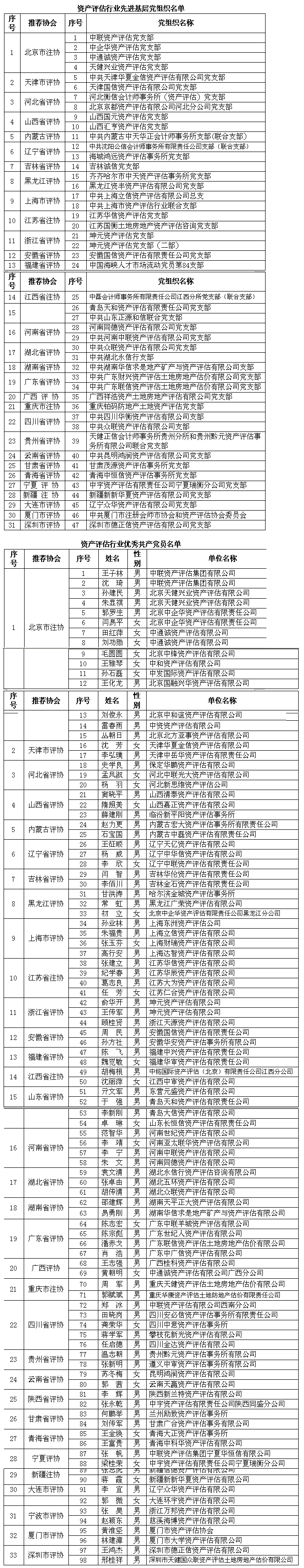 资产评估行业先进基层党组织名单